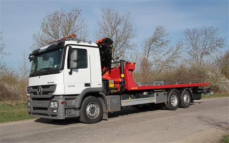 Equipement Simplex 8T, plateau basculant coulissant sur faux chassis et basculeur peints anti-corrosion avec mise à dimensions optimisée du porte à faux. Les fonctions sont hydrauliques avec amortissement de fin de course integré pour éviter les à-coups. La capacité technique maximale de l'équipement est de 8000 kg.